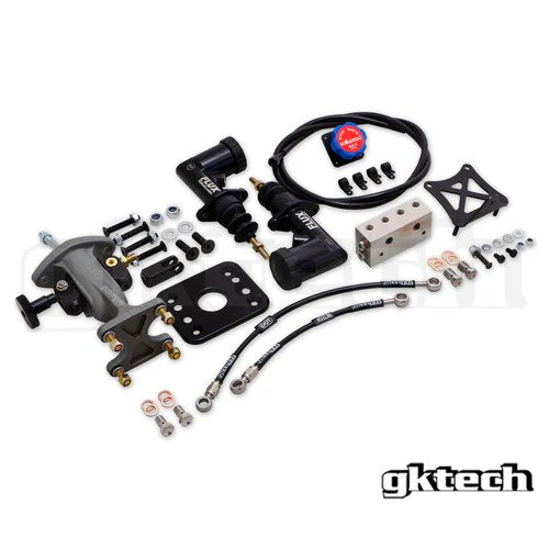 Using the GKTECH Dual master cylinder adapter bracket and clevis with wilwoods balance bar design alleviates all of these problems. The OEM pedal assembly is retained, the pedal ratio is adjusted, swappable front / rear master cylinders allow it to suit any brake setup and bias can be adjusted on the fly (using wilwoods balance bar adjuster cable).