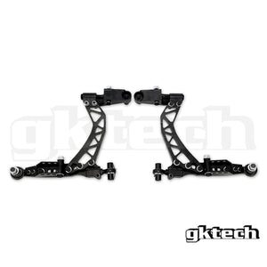 The GKTECH Super Lock front lower control arms simplify, improve and replace the front lower control arm and compression rods on the Z34 370z/V36, while also supporting around 65+ degrees of steering lock.