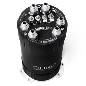 The 2nd generation Nuke Performance 3.0 liter Fuel Surge Tank for external fuel pumps, now with three outlets for up to three external fuel pumps. Top-quality combined with outstanding performance.