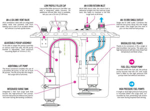 The Nuke Performance CFC Unit for brushless fuel pumps - Competition Fuel Cell Unit, with integrated fuel surge tank is designed to utilize one or two brushless fuel pumps within the integrated surge tank. This lets you choose a smaller pickup fuel pump with fewer amps, less heat, and lower fuel temperature as a result.