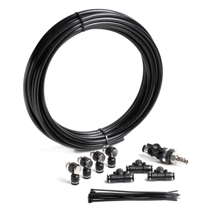 Within the hose kit you get 10m (32.8ft) 8mm quick connect pneufit hose, 3x quick connect T-fittings, 4x quick connect 1/4" BSPP barb fittings for the Air Jack inlets and a petcock ball valve. This kit is ideal for a low pressure 8 BAR / 120 PSI setup and is extremely lightweight, easy to install, durable and affordable. When you buy one of the Air Jack kits this hose kit is included.